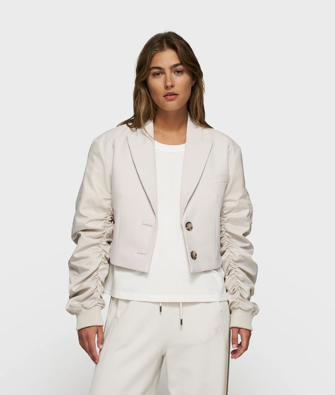 Relaxed Fit Blazer mit Bomberjackenärmeln mit einem Körper aus Stretch-Crêpe und gefütterten Nylonärmeln. Mit gerafften Ärmeln, weichem Steppfutter, Reverskragen, Knopfverschluss vorne, Fake-Brusttasche, Reißverschlusstasche am linken Ärmel, einer Innentasche und einem Label auf dem Rücken.