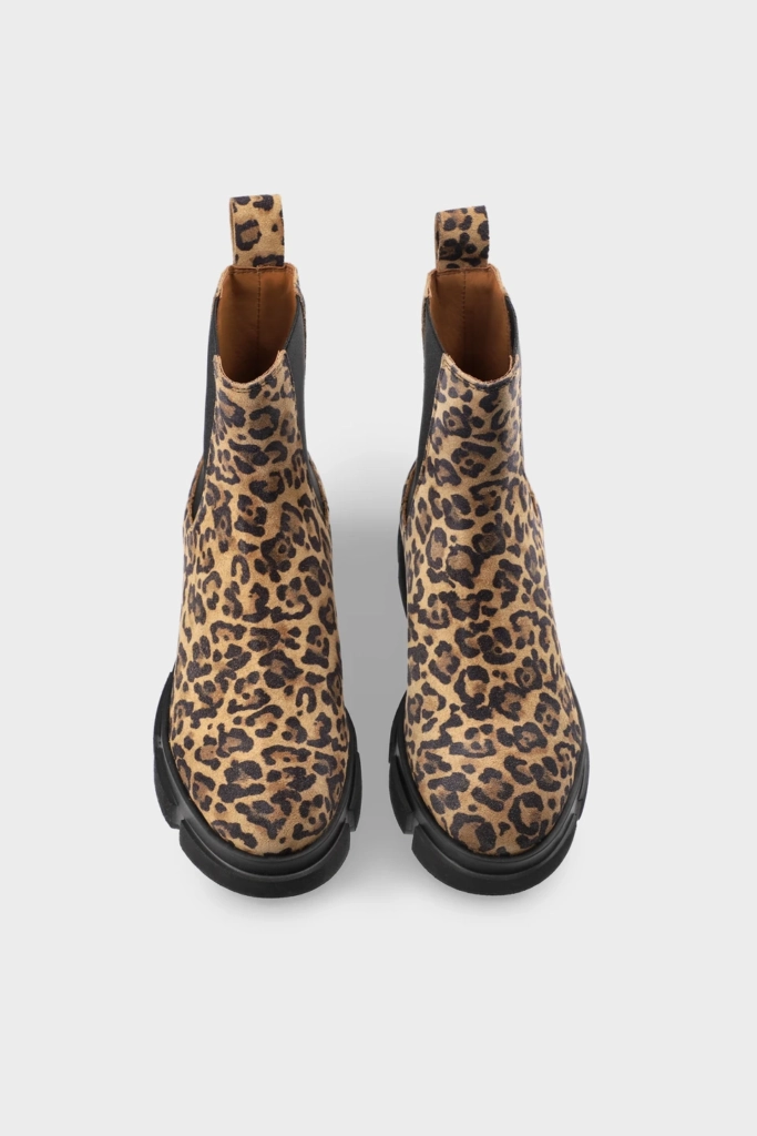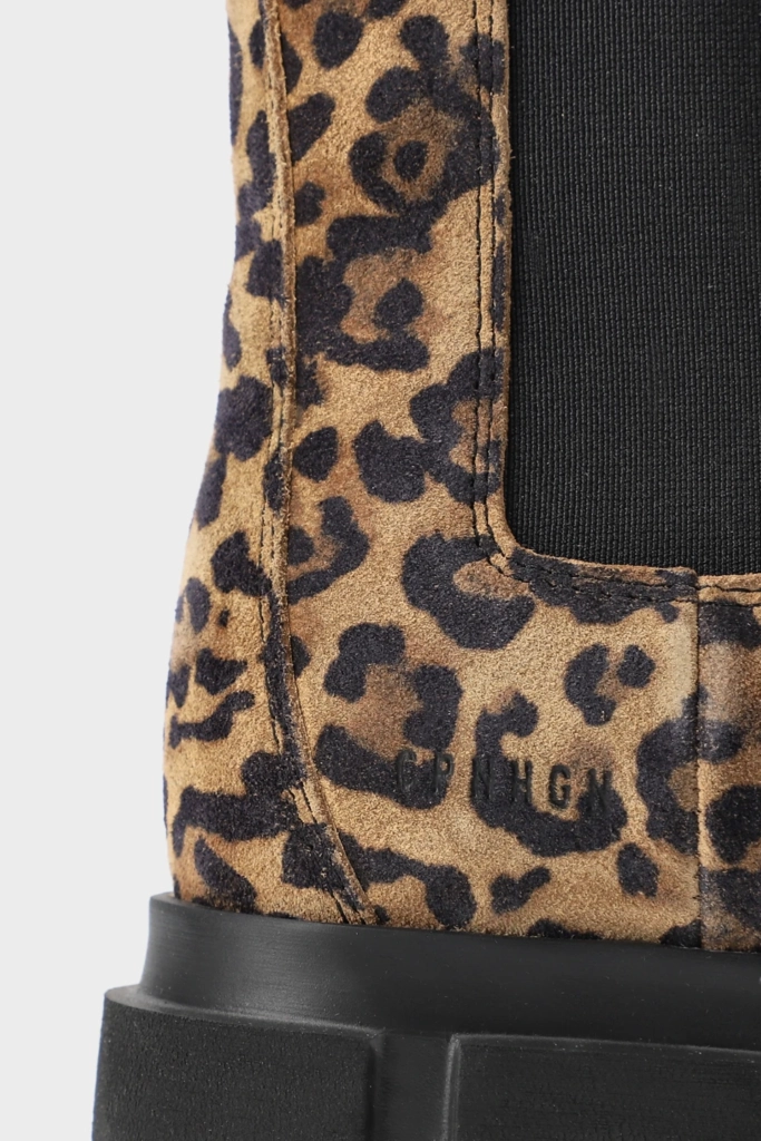 In Leo. Weiches Suede, ein zurückhaltender Animal Print und eine klare, leicht klobige Form – diese knöchelhohen Chelsea Boots bringen Komfort und Charakter in Einklang. Elastische Einsätze mit feinen Stickdetails sorgen für Flexibilität und einen dezenten Twist. Das Logo an der Außenseite setzt einen sanften Akzent, die Zugschlaufe hinten macht das Anziehen unkompliziert. Die runde Kappe und die markant profilierte Sohle mit Blockabsatz runden das Design ab.