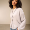 Kurze locker geschnittene Strickjacke mit drapiertem Schalkragen, verschliessbar mit einem Manschetten-Knopf.